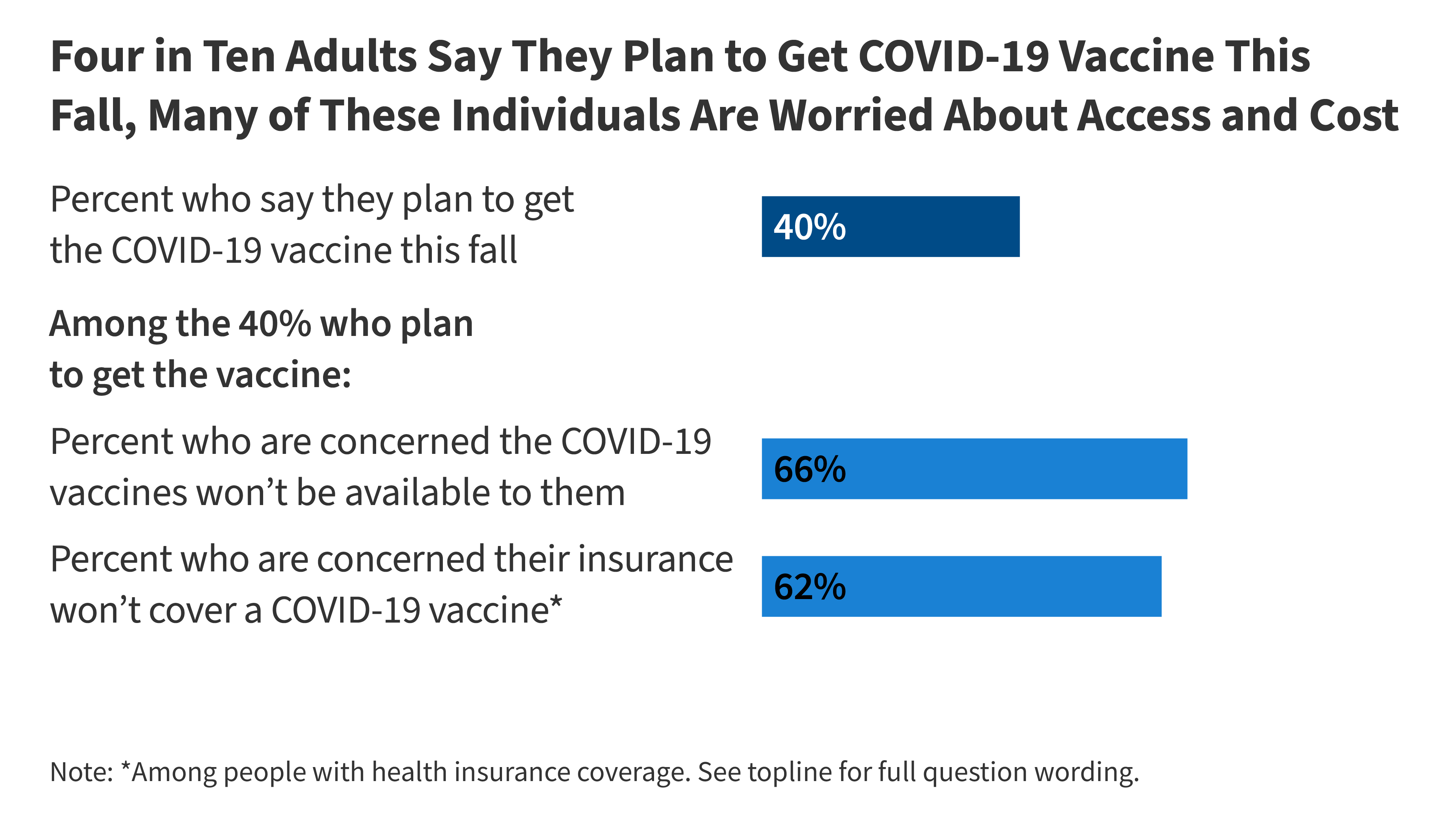 Those that plan to get the vaccine are more likely to be involved that it may not be obtainable to them. Amongst those that say they’ll “undoubtedly” or “in all probability” get a COVID-19 vaccine this fall, two-thirds (66%) are involved that the vaccine received’t be obtainable to them, whereas six in ten (62%) of insured adults who will possible get a vaccine this fall are involved their insurance coverage received’t cowl it. Predictably, nearly one in ten of those that possible received’t get the vaccine are involved about availability (11%) or insurance coverage protection (14%).