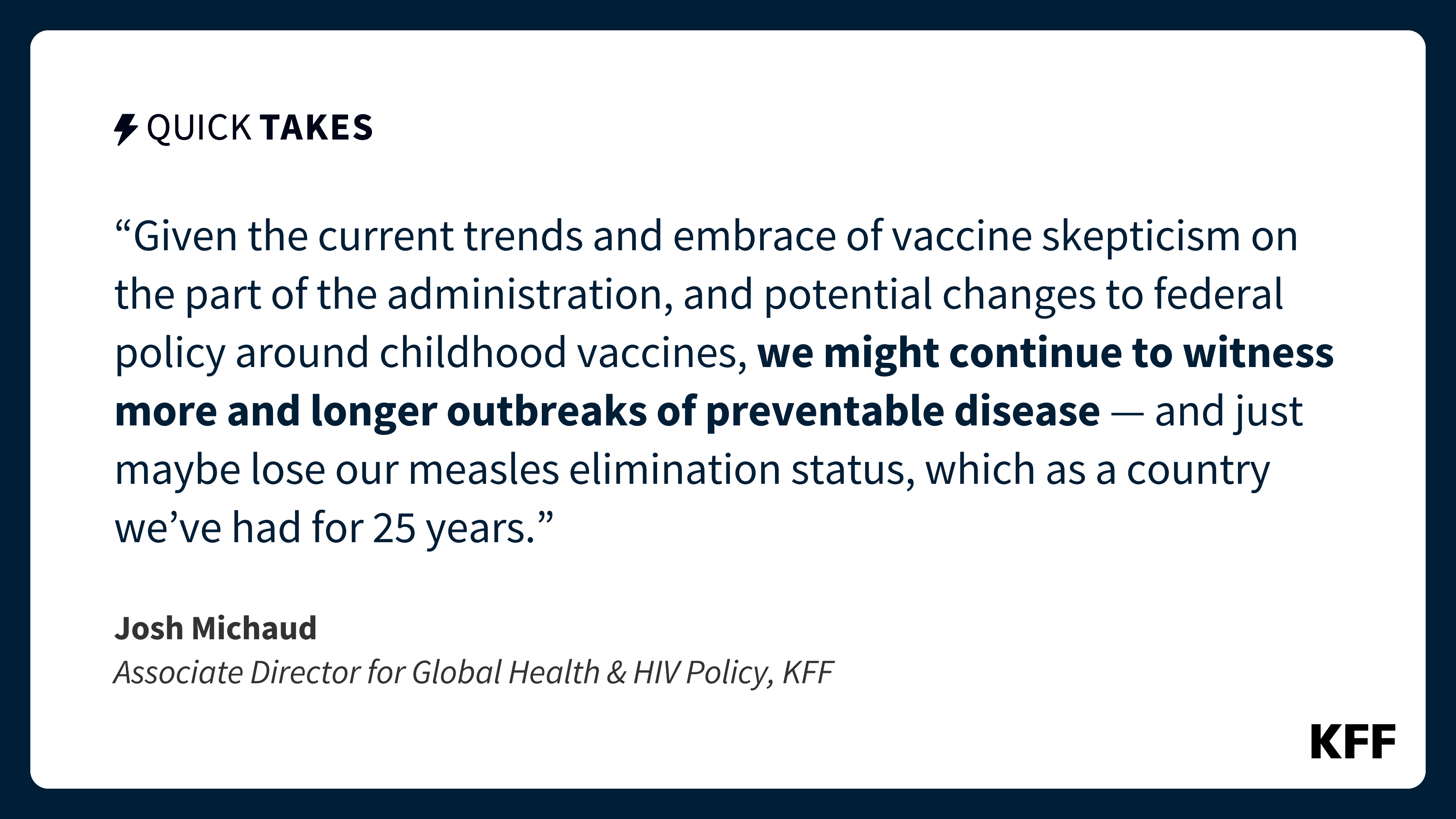 Thus far, the Trump Administration has not demonstrated a lot urgency in response to the state of affairs. On February 27, the Facilities for Illness Management and Prevention launched a brief statement concerning the Texas measles outbreak, “Vaccination stays the most effective protection in opposition to measles an infection.” This week Secretary of Well being and Human Providers Robert F. Kennedy Jr. commented that measles outbreaks are “not unusual,” however didn’t point out vaccinations. Kennedy has a history of talking out in opposition to the measles vaccine and has repeatedly linked MMR vaccination with the event of autism (a hyperlink that has been proven again and again to not exist). In current weeks, he has urged that as HHS Secretary, he would revisit the vaccine schedule really useful by the CDC after promising to not change it throughout his affirmation hearings. All of this can be a notable contrast from the primary Trump Administration, which had proactive messaging in assist of measles vaccination through the outbreak in 2019. Given the present traits and embrace of vaccine skepticism on the a part of the administration, and potential changes to federal policy round childhood vaccines, we’d proceed to witness extra and longer outbreaks of preventable illness—and simply perhaps lose our measles elimination standing, which as a rustic we’ve had for 25 years.